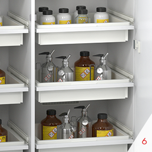 Kemikaaleja voidaan säilyttää turvallisesti molemmin käsin helposti liikuteltavien ulosvedettävien vetolaatikoiden ansiosta.