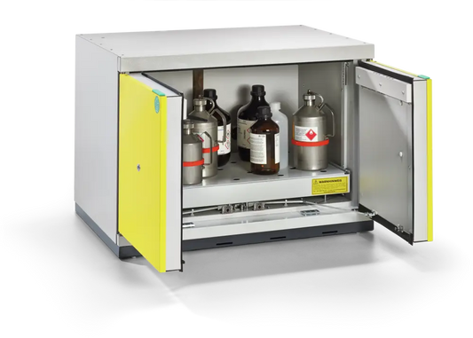 Vaarallisten aineiden käsittelyyn ja varastointiin liittyy tiukkoja määräyksiä ja hyvästä syystä. Toiminnan harjoittajan tulee ymmärtää eri kemikaaleihin liittyvät vaarat ja ottaa ne huomioon kemikaalien säilytyksessä. Tuemme sinua oikeanlaisen ja turvallisen kemikaalisäilytysratkaisun valinnassa. Valikoimamme kattaa erikokoiset kaappiratkaisut ja lisävarusteet kemikaalien säilytykseen sekä käsittelyyn.