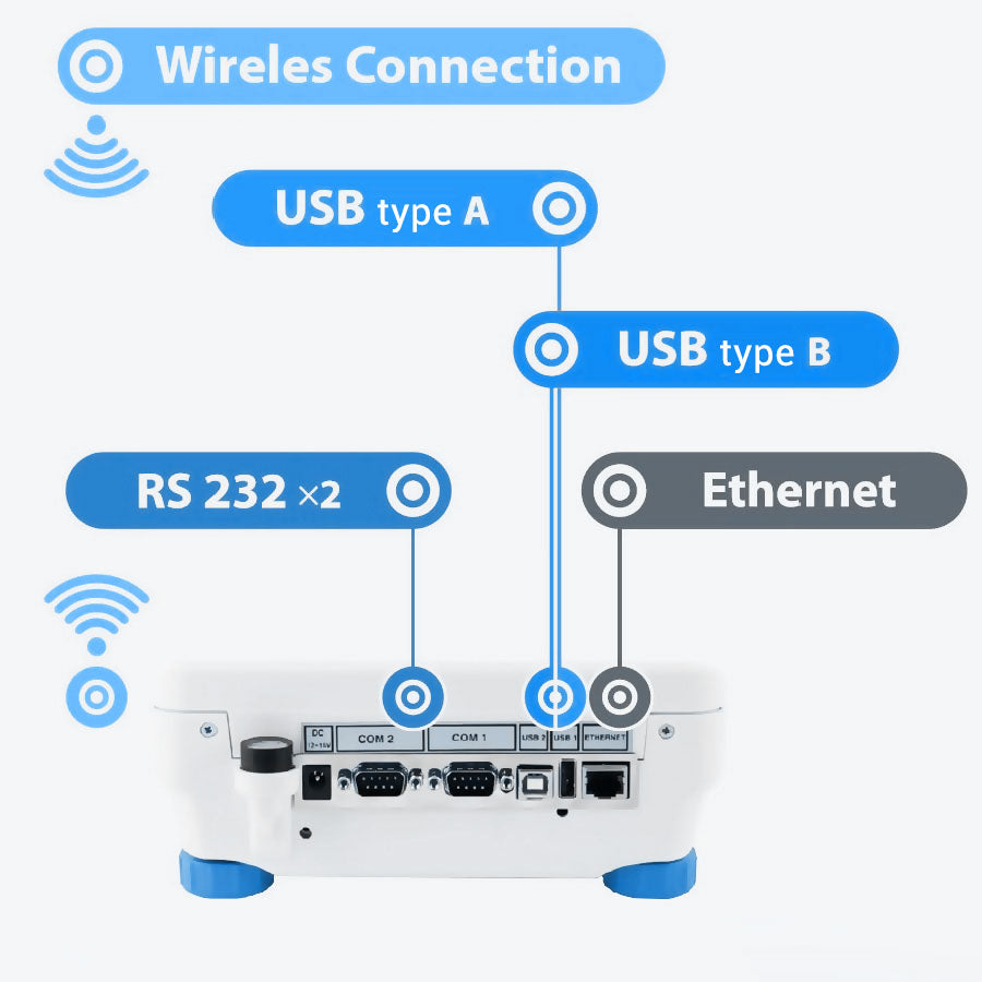 The functionality of AS X2 PLUS balances can be expanded using the following communication interfaces:USB-A, USB-B, RS 232, DB9 tara/print, Ethernet, Wi-Fi®. The additional USB port located on the front of the balance enables easy and fast communication with the USB flash drive, it is possible to connect additional devices via this port too. AS PLUS balances are equipped with Kensington Lock, which allows to secure the device against theft.