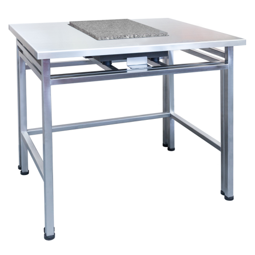 The antivibration table is specifically designed to eliminate ground vibrations during the use of laboratory equipment such as microbalances, analytical balances, and similar devices. It is composed of two separate structures: an outer frame that isolates the working area and an inner assembly. The working area consists of a table and a stone platform, separated by a vibration damper to ensure stability.