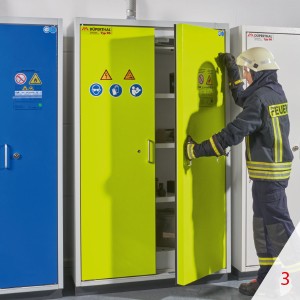 Classical door technology (door handle), door hinge right For the storage of lithium-ion batteries. Type-tested by MPA/ TÜV SÜD according to DIN EN 14470-1, DIN EN 16121, DIN EN 16122, and DIN 31000. Loss prevention in terms of VdS 3103. Mark of approval: Safety tested and CE mark. Construction and colour: