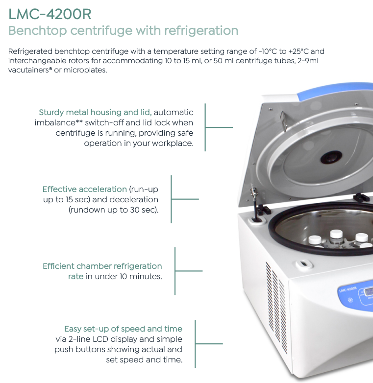 The LMC-4200R is an advanced centrifuge designed for sensitive applications where maintaining controlled temperatures is critical. Interchangeable rotors for accommodating centrifuge tubes (10 to 15 ml or 50 ml) or microplates.