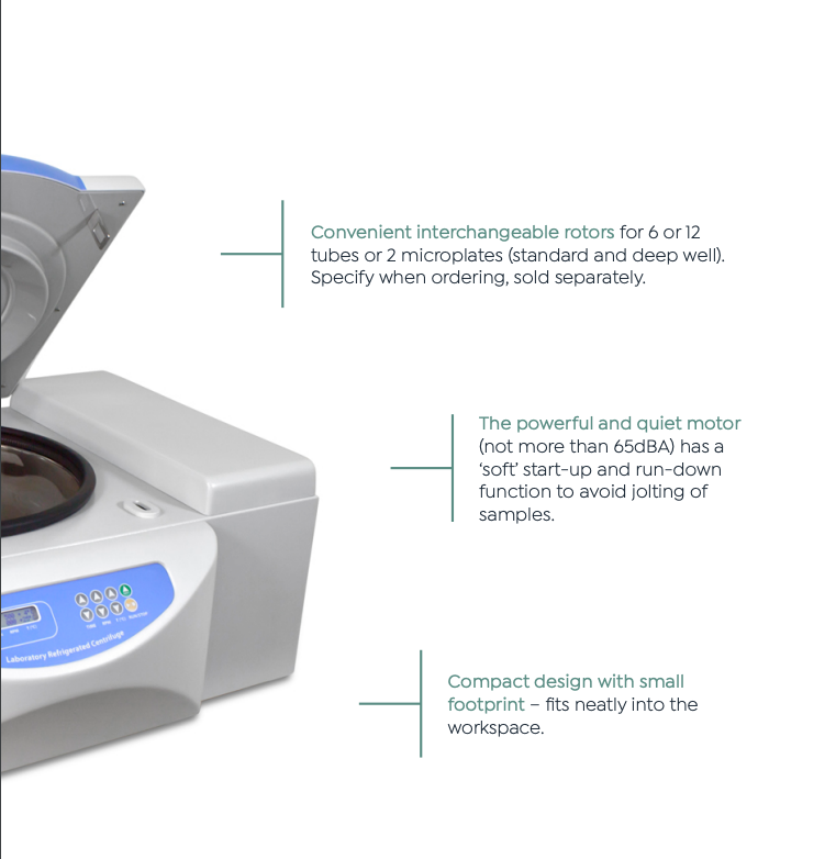 - Choice of interchangeable rotors for up to 12 centrifuge tubes or 2 microplates