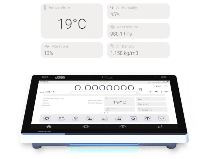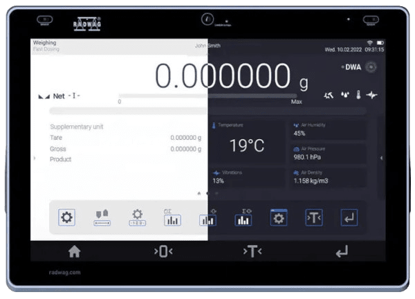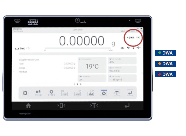 Varmistaa, että vaakasi on käyttövalmis. Se mahdollistaa ilman nosteen kompensoinnin reaaliajassa. Lisäksi se kertoo tarpeesta suorittaa vaa'an määräaikaistarkastus tai -hyväksyntä tarkkuuden ja herkkyyden osalta.