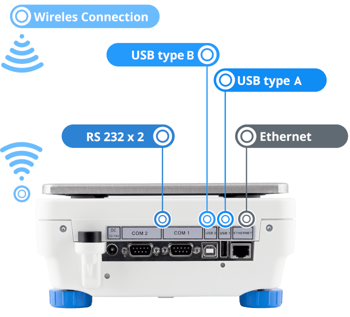 WLC X7-vaaka on varustettu useilla liitännöillä: 2 x RS 232, USB type A, USB type B ja langaton yhteys.